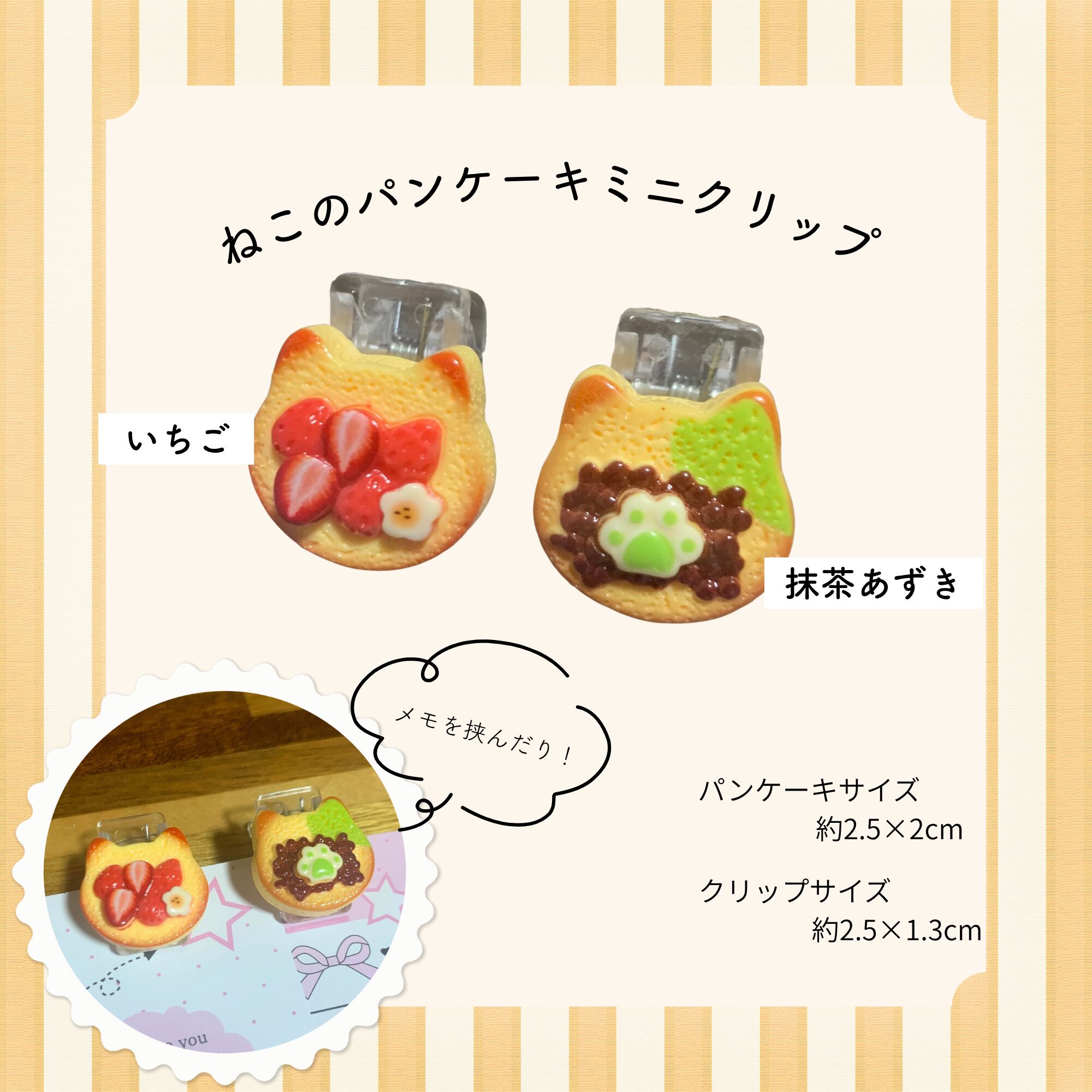 猫好きな方やパンケーキファンには特におすすめのデザインです。このミニクリップを使って、日常の小物に少しの楽しさを加えてみてくださいね!